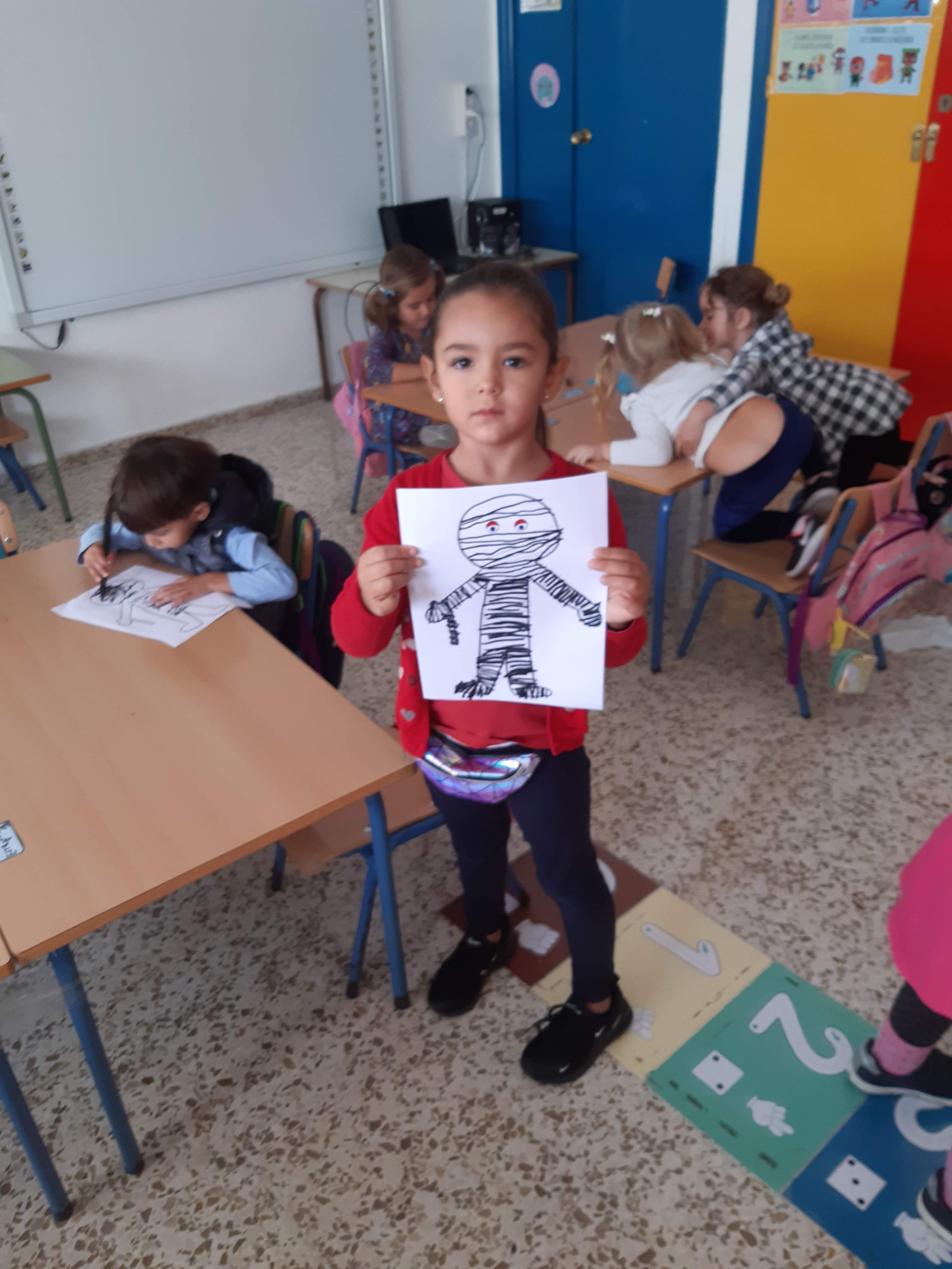 Después hemos recibido la visita de la momia Jacinta. Pero la pobre tenía un problema, se le habían caído sus preciosas líneas, y parecía un fantasma en vez de una momia, pero nosotros la hemos ayudado y ha quedado genial.