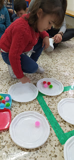 ELLOS AQUI TENIAN QUE COGER EL PLATO CON LA CANTIDAD CORRECTA Y PONERLO AL LADO (ACTIVIDAD DE HACER CORRESPONDENCIAS). ( EJEMPLO) EL PLATO CON DOS POMPONES AL LADO DEL PLATO DE DOS POMPONES.
